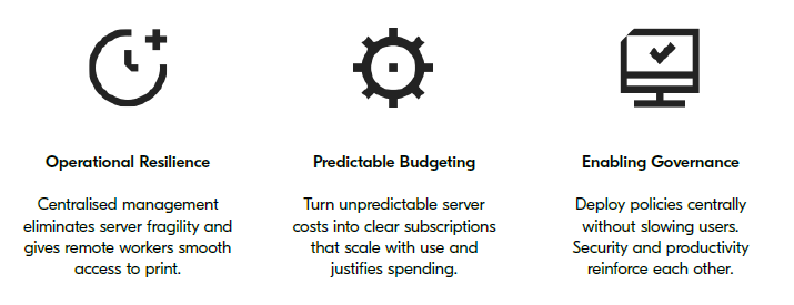 The result of this equation points towards one solution: cloud printing software and cloud solutions are how organisations shrink their footprint, stabilise costs, and stay secure in the cloud without adding IT overhead.